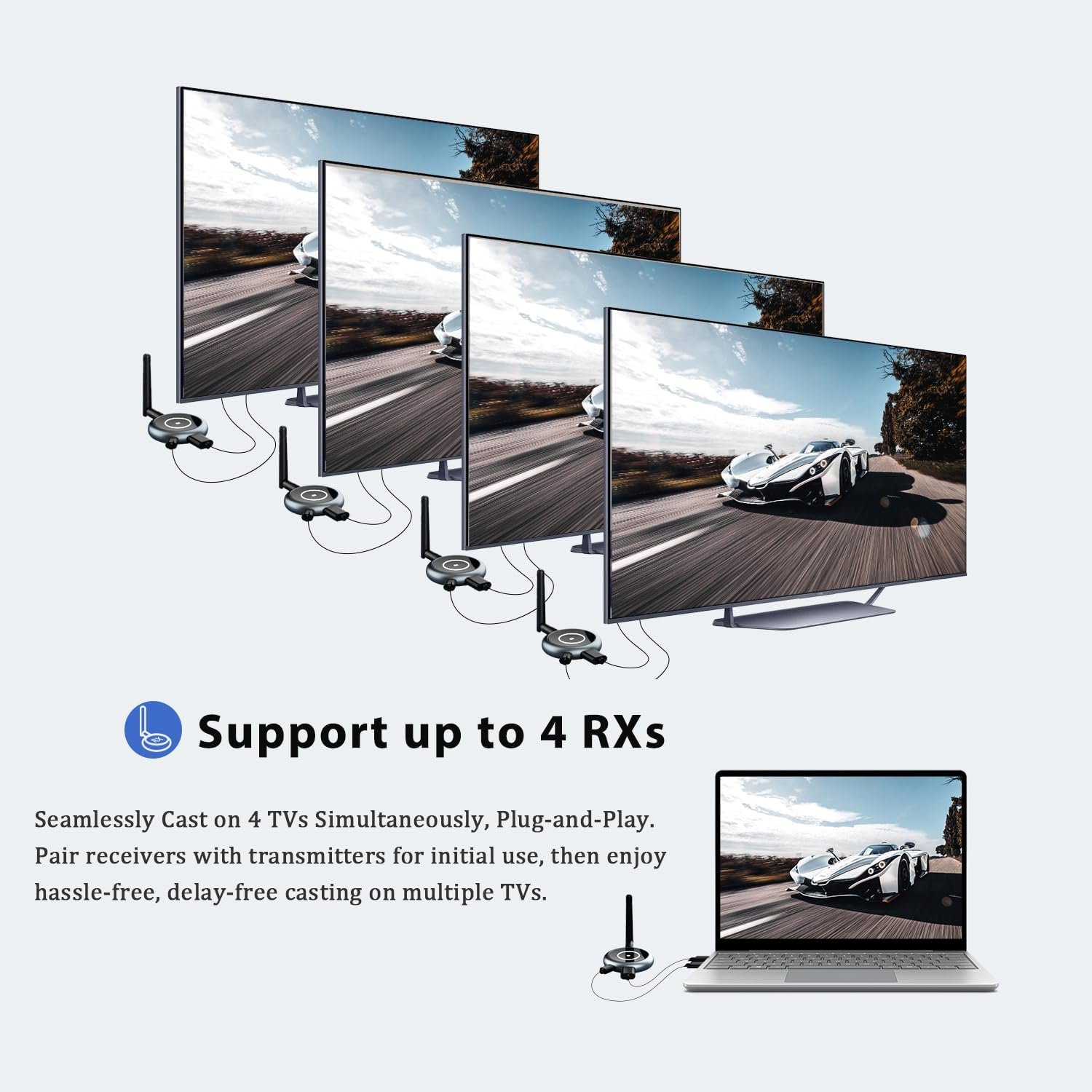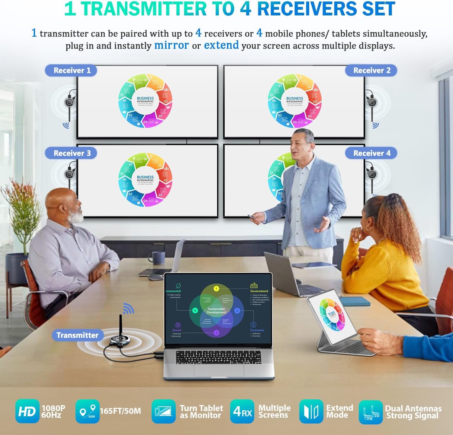 【Erweitern Sie Ihr ansehen Mit Mehreren Empfängern】 Der Kabellose Hdmi Extender von Aiabo Wird MIT 1 Absender und 4 Empfännern Geliefert, Sodensie Inhalte Gleichzeit -vier bildschirmenen in mehrernen. Ideal für Räume Wie Konferenzruume, Geschäfete, Bars, Wohnmobile und überwachungseinrichtungen, Die Ein -Gemeinsame Nuttzung Mehrer bildschirne Erfordern