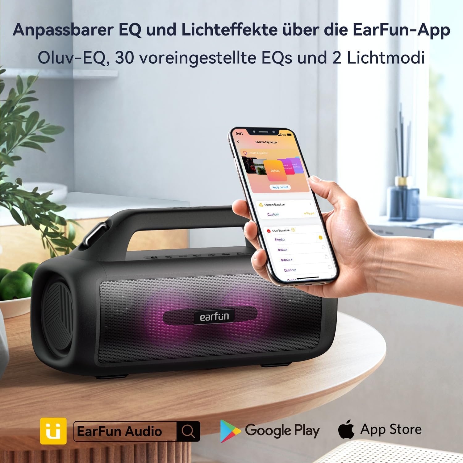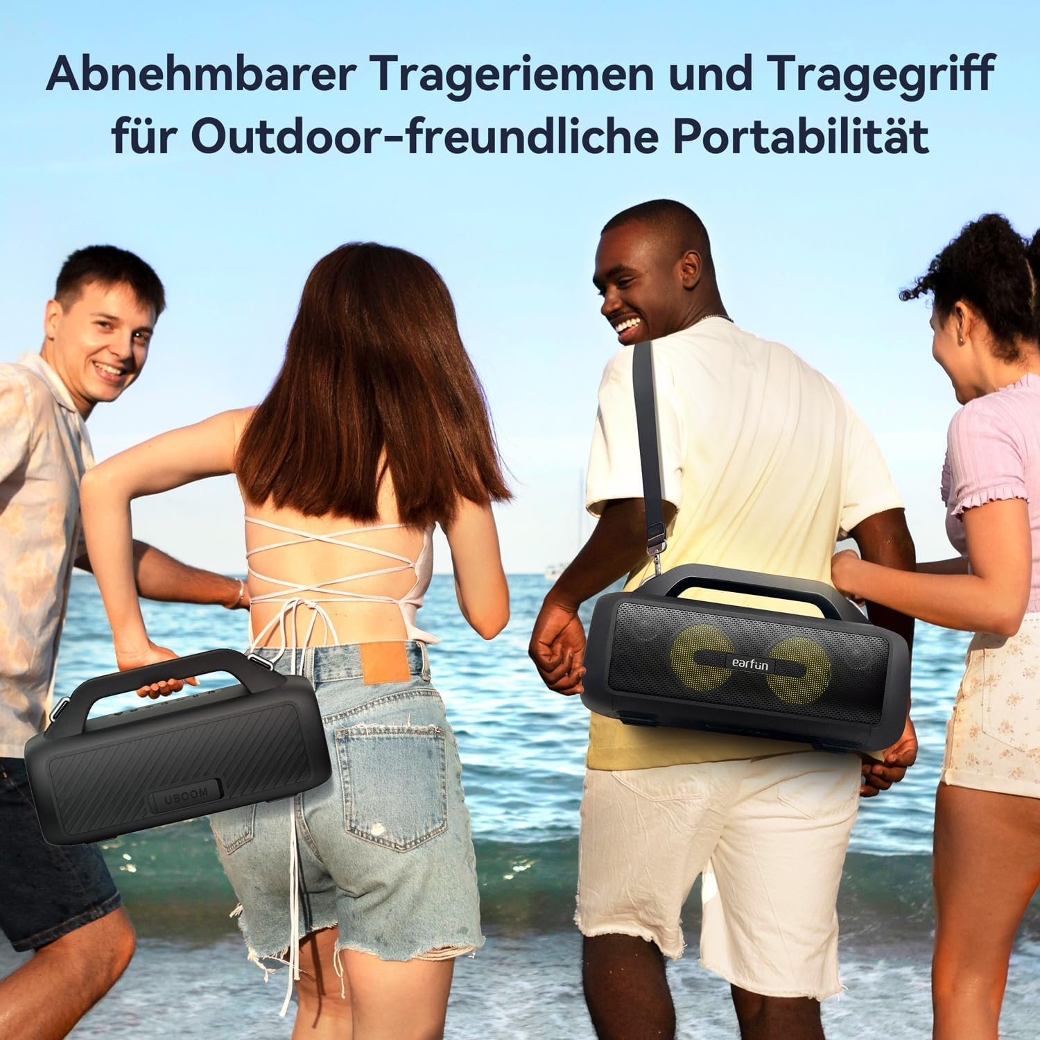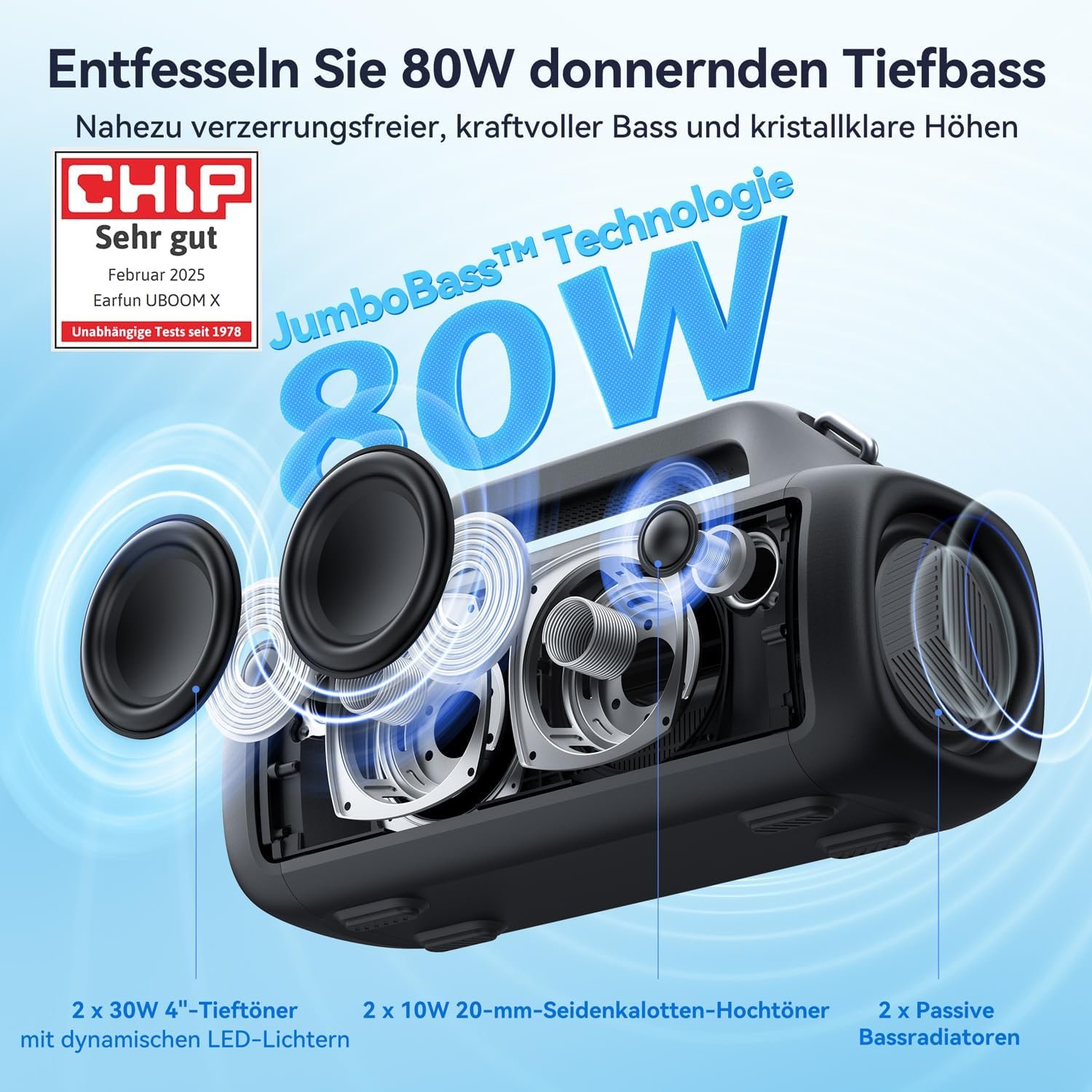 Earfun Uboom X Bluetooth Lautsprecher, 80W Bass, Jumbobass Tech, Oluv Eq, 30 Std Akku, IP67 Wasserdicht & Staubdicht, RGB Lichter Musicbox Bluetooth, Power Bank, BT 5.3, Tragbart Lautspecher Fürr Party