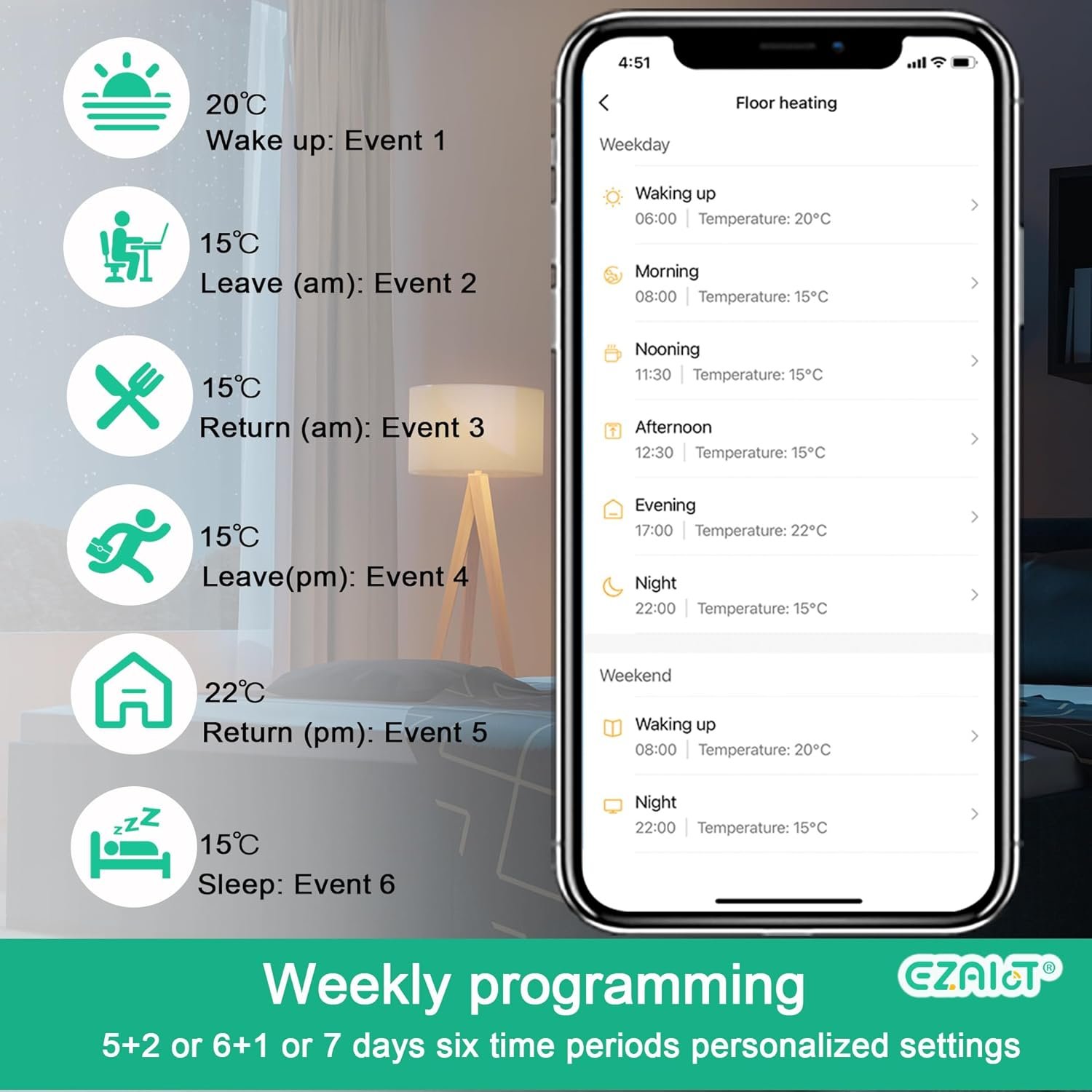 Fernsteuerung: Sie Kön Können IHR Smartphone Oder Tablet Verwenden, Umhr Ezaiot Smart Thermostat über die Smart Life App Fernzusteuern, z. Das Bebeutet, Dass Sie Die Temperatur Einer -Anspasssen Können, Bevor Sie das Haus HAUS LASSEN AN ANACH HUSUSE Kommen, Um Sicherzustellen, Dass Sieich Wohl -Wohlfälen, Verenn Sie Zu Hause Sind.