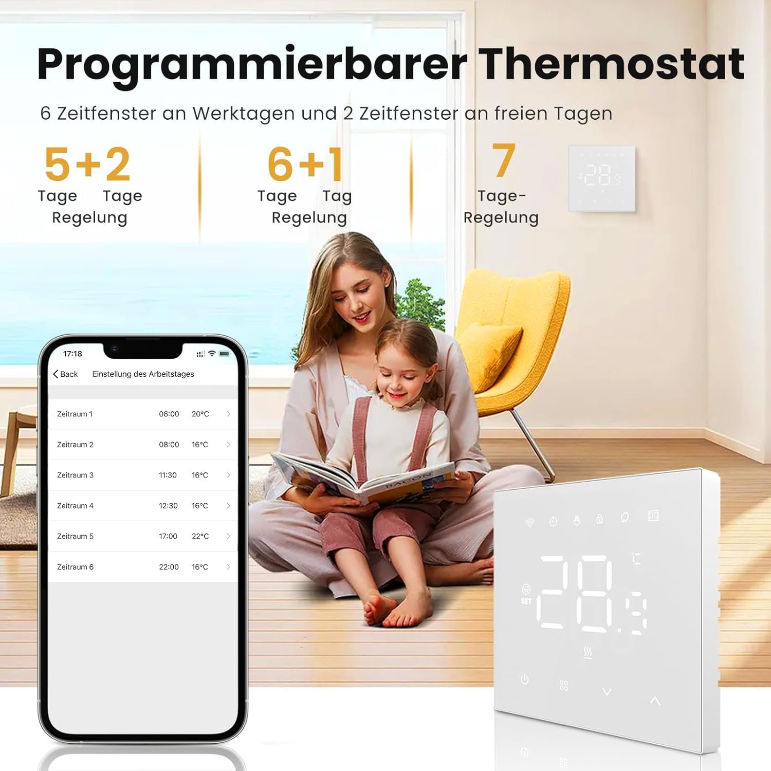 ♨️ 【Programmierbarer Fußbodenheizung Thermostat】 der Intelligenz Thermostat wlan unterstütttoo modi (Manueller modus/programmiermodus). IM Programmiermodus Stehen 5 + 2 Tage / 6 + 1 Tag / 7 Tage Temperaturinsstellungen zum VerefÜGung. MIT 6 Zeitfenstern Pro Tag giBt es Ihenen Die Freiheit, Ihren Wegenplan Zu Planen und Hilft Ihenen, Energie und Kosten Zu Sparen und Stromgetrechungen Zu Sparen.