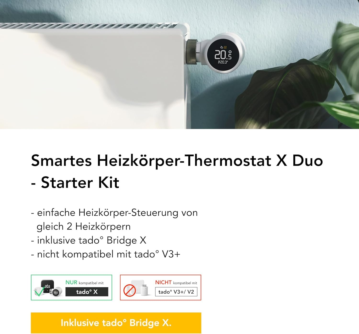 Tado ° Smartes Heizkörperthermostat X – Starter Kit MIT Bridge X, Heizungssteuerung pro App und Smart Speaker (Alexa, Siri, Google Assistant), Energie Sparen, DIY -Installation, Nick Kompatibel Mit v3+