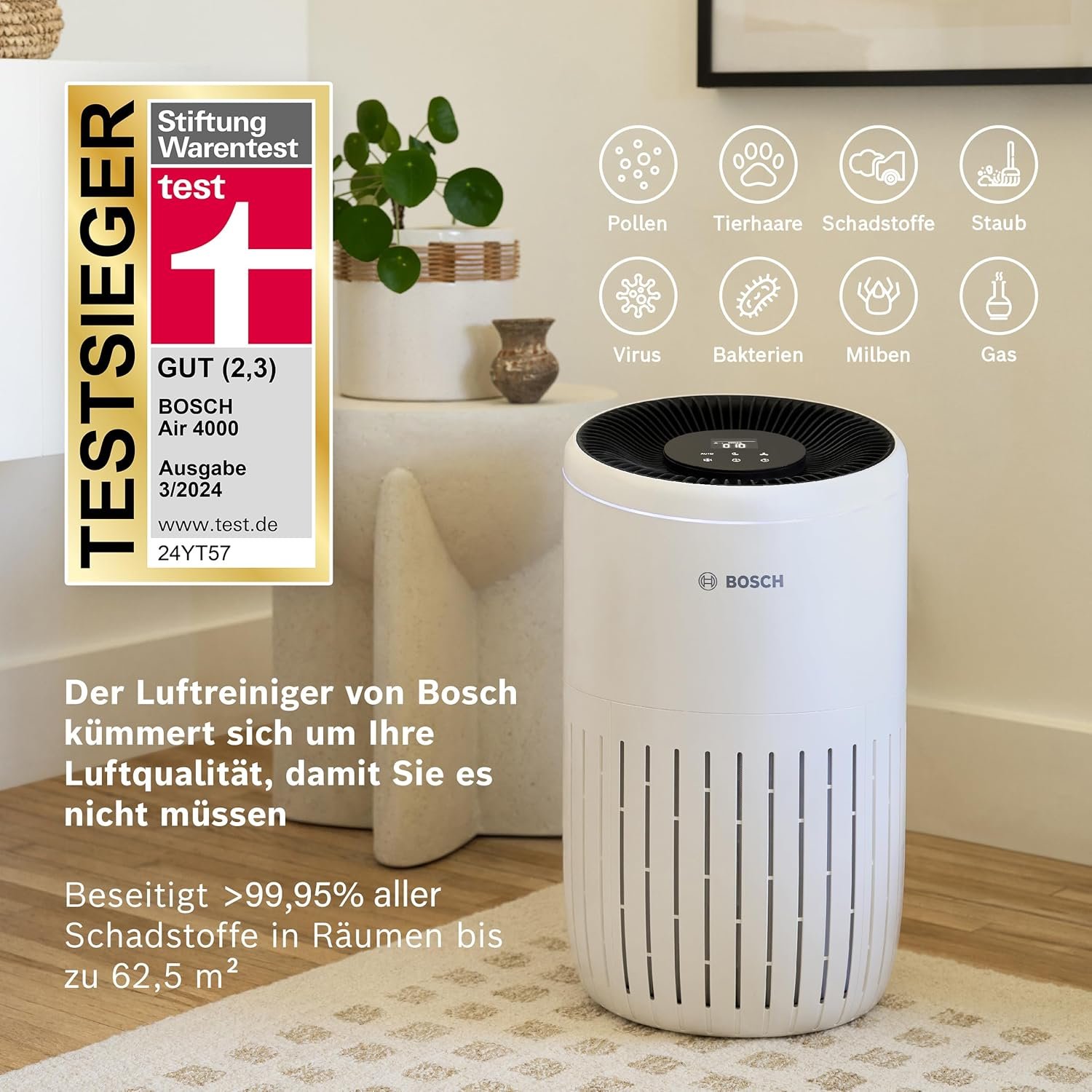 Testsieger und umwelttipp: Der Bosch Air 4000 Luftreiniger Wurde von Stiftung Warentest ALS Testsieger Mit der Anmerkung 2,3 Ausgezichnet für Seine luftreinigungfähgeFähigKeuten und Punktet Zudem Mit Dem -Geringsten Stromverbrauch. (Ausgabe 03/2024 – Lizenz -Nummer 24YT57)