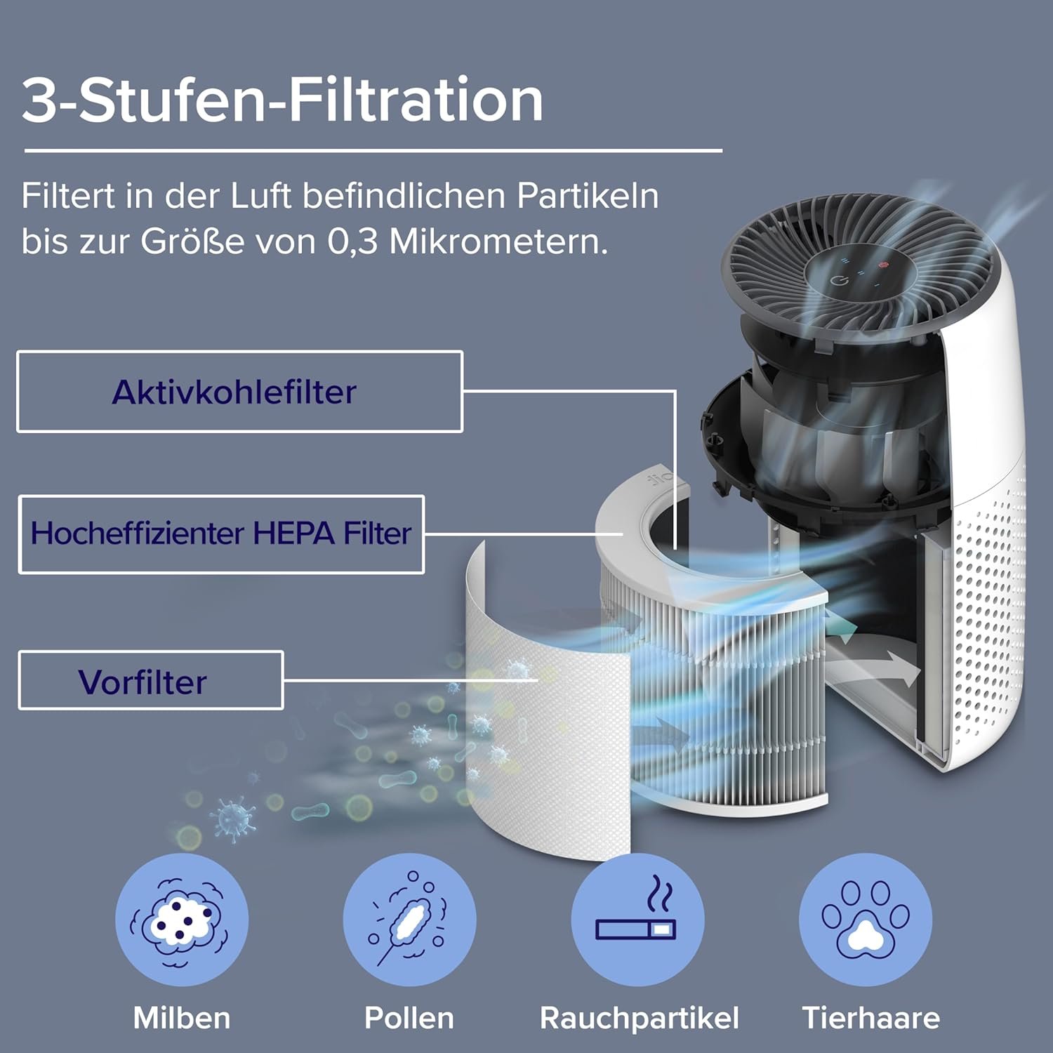 Echter HEPA-Filter: Der Hepa-Filter Erfasst 0,3-µm-partikel aus der Luft in 3 Schritten; Ideal für Allergiker, Kinder und haugierterbesine