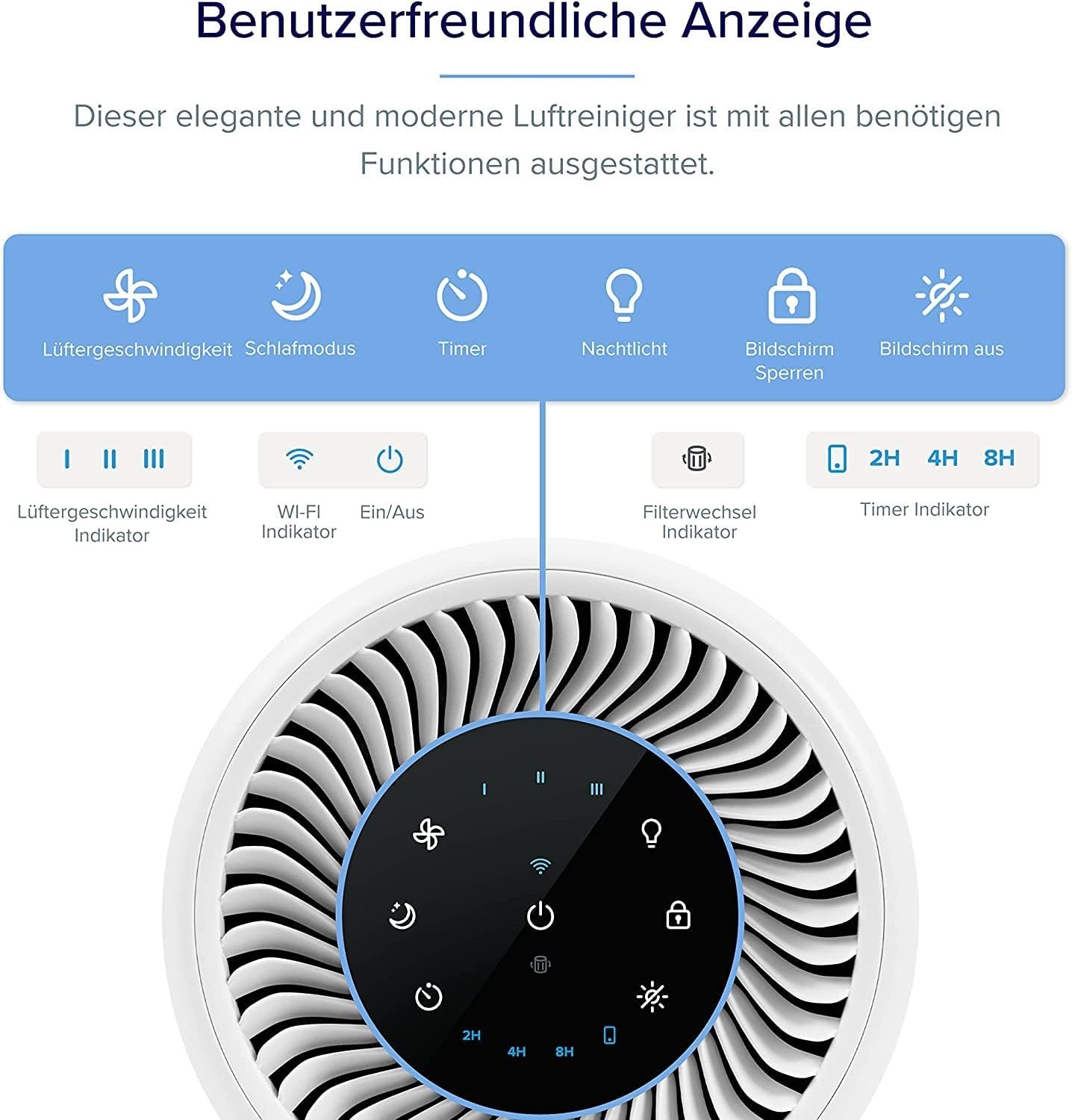 Smart Fernbedienung: Per Vesync App Können Sie überall lüfterstufe und modus aarder, filterlebensdauer prüfen, Zeitplänne Festlegen, Timer Einstellen; Dirch Alexa und Google -Assistent Können Sie Die Lüfterstufe aardern und das Gerät ein/Ausschalten