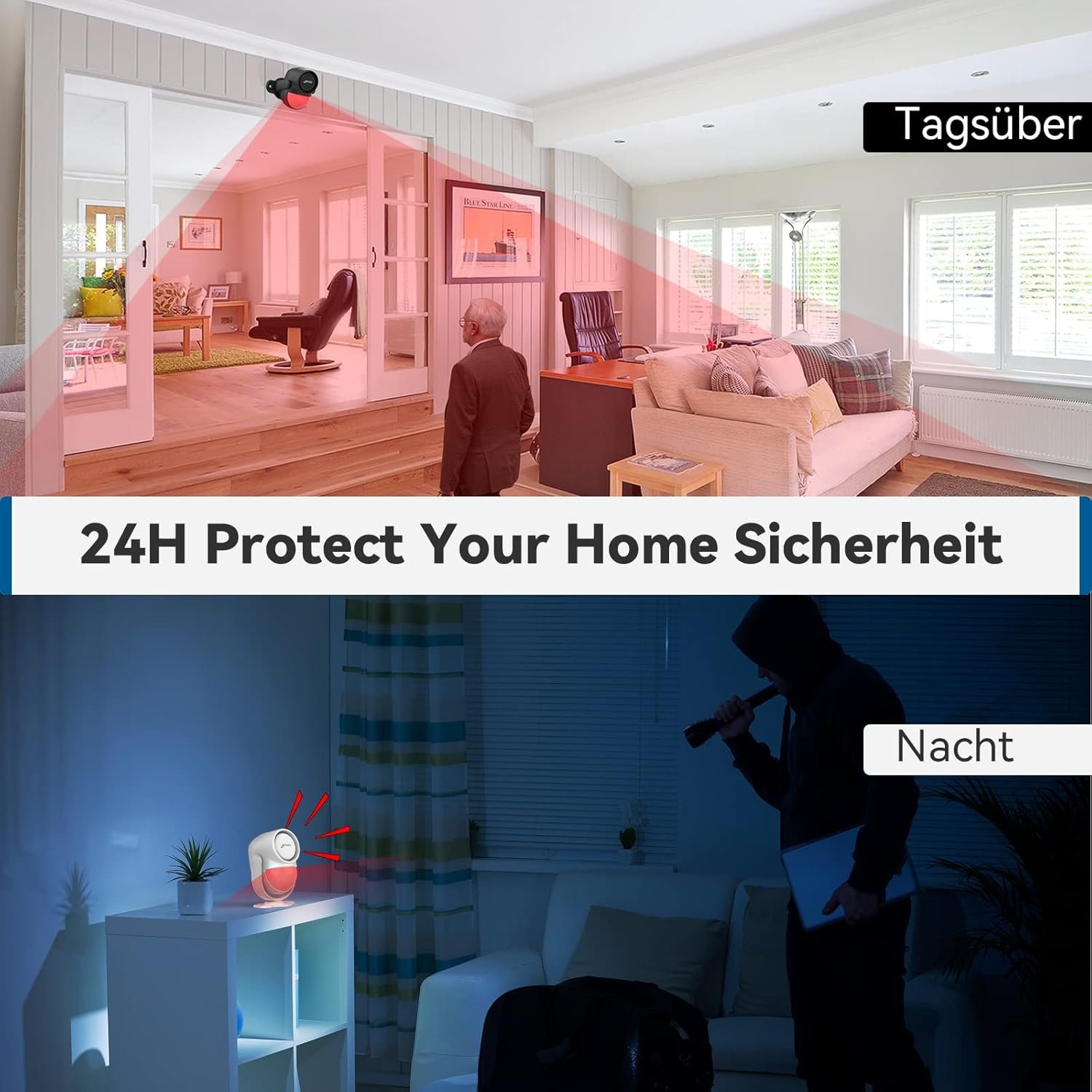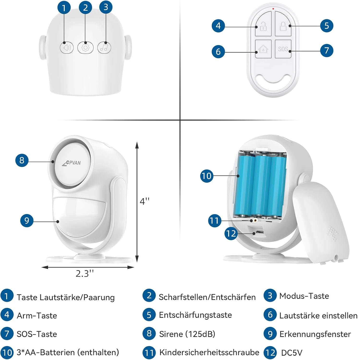 【Sicheres Design】- Cpvan Alarmanlage Bewegungsmelder VerefÜgt über die Fortschnittlich InfraroterKennungstechnologie MIT Einer Reichgewich von 5-8 Metrag. DARUBER Hininus VerefÜgt der Cpvan Mobile Alarmanlage über 125-db-sirene, sterben in Offenen Bereichen Ein Reichweiite von bis Zu 100 Micker. Sie Kann Sowohl Eindinglingle Abschrecken als auch Sie Rehtzeitig alarmieren. Also Sind Sie und Ihre Familie Jederzeit Sicher.