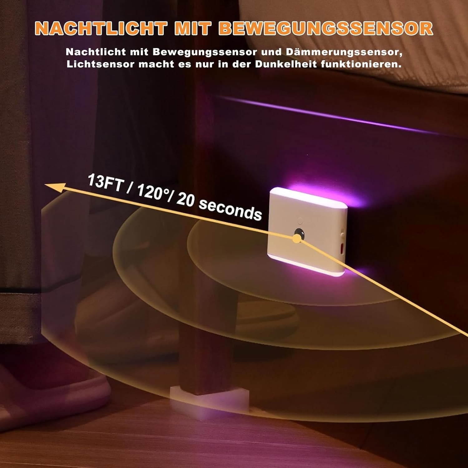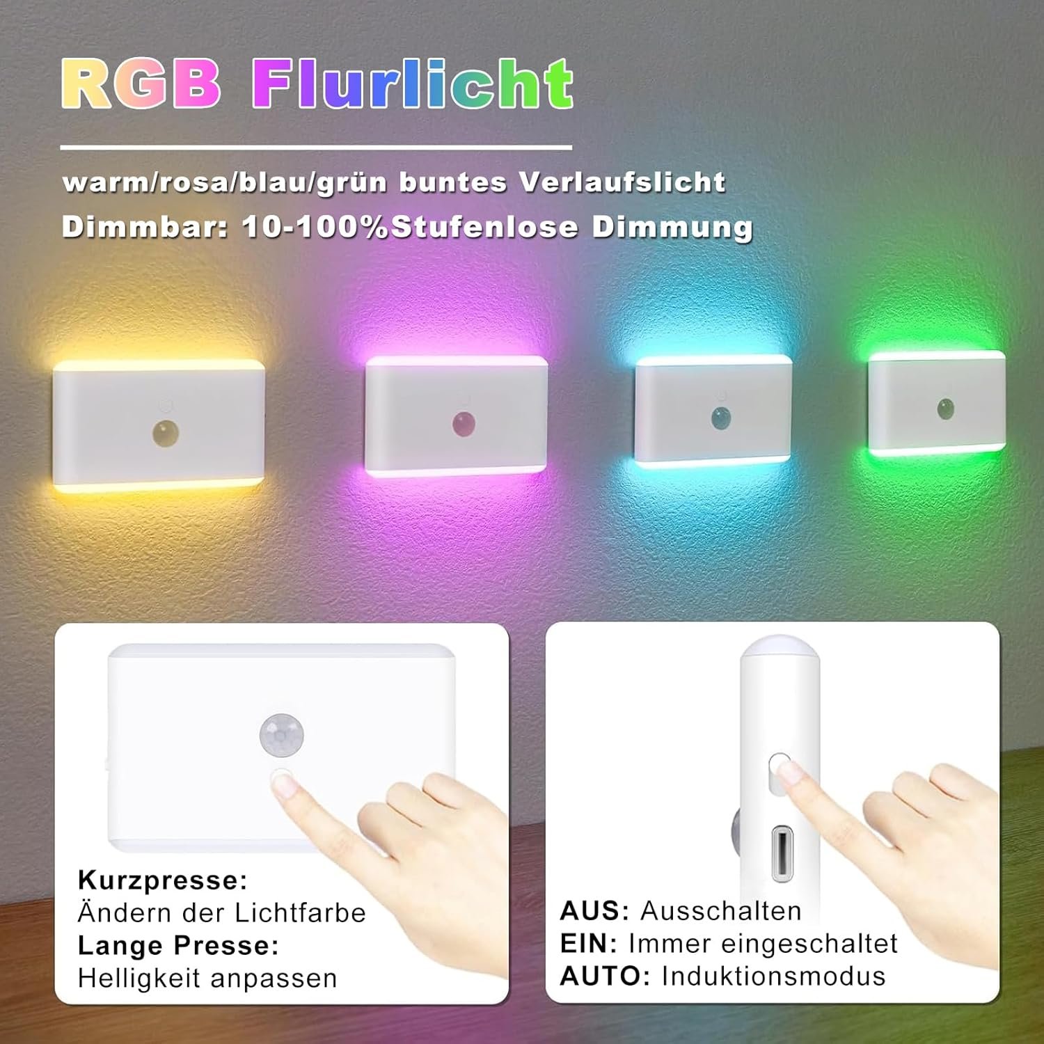 Dimmable RGB nachtlichT: Das nachtlich des Bewegungssensors Leuchtet auf und ab, mit Einem Größenen Beleuchtungsberich. Wehmlen Sie Zwischer Warmem Licht, Rosa Licht, Blauem Licht, Grünem Licht 4-Farben-Oder Buntem Zyklus für Lustige nachtlichtshow. LED-NACHTLEUMTEN MIT STUFENLOSER DIMMFUNKTION, FILDEN SIE DIE ROCHTIGE HELLIGEIT IN JEDER LISTUMgebung, Also Dasssien Sien-Das-Haus-Haus-Gehen Können, Ohne Das Hauptlicht Einzuschalten.