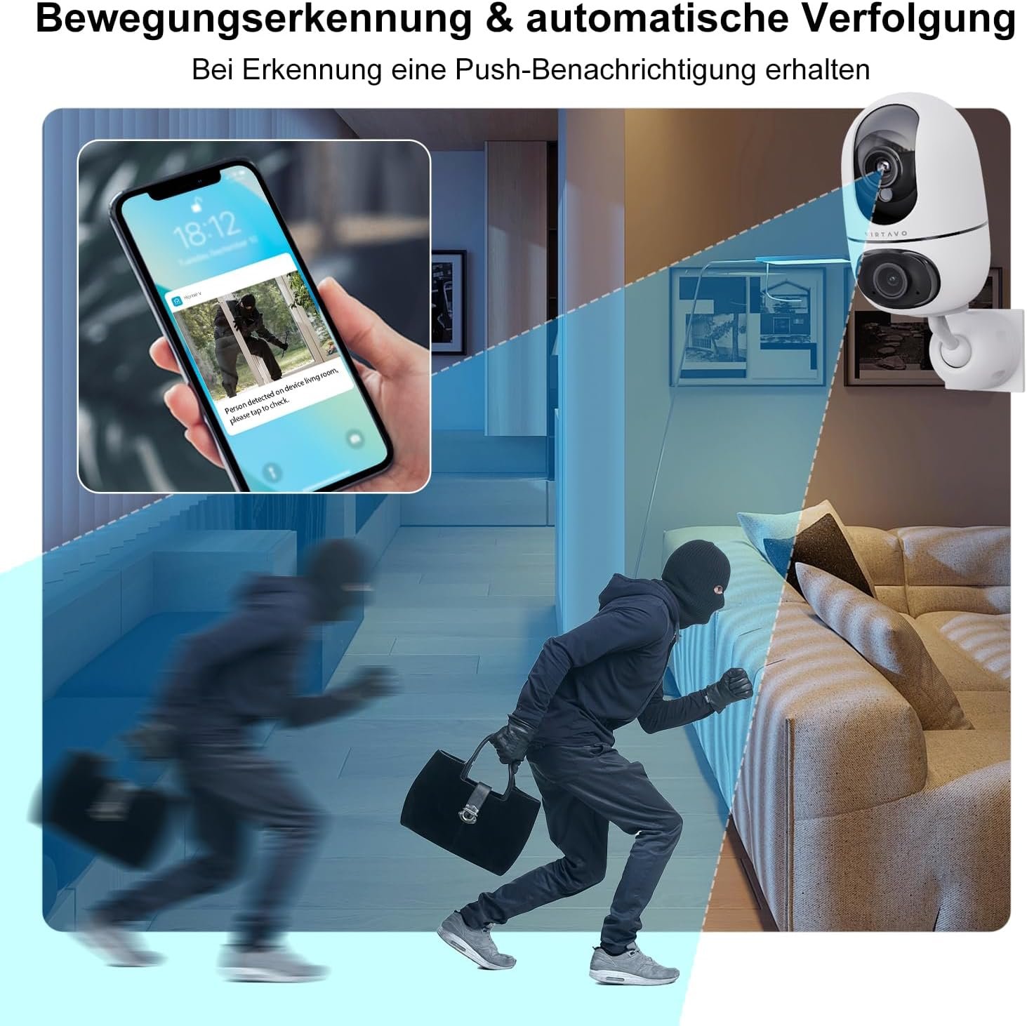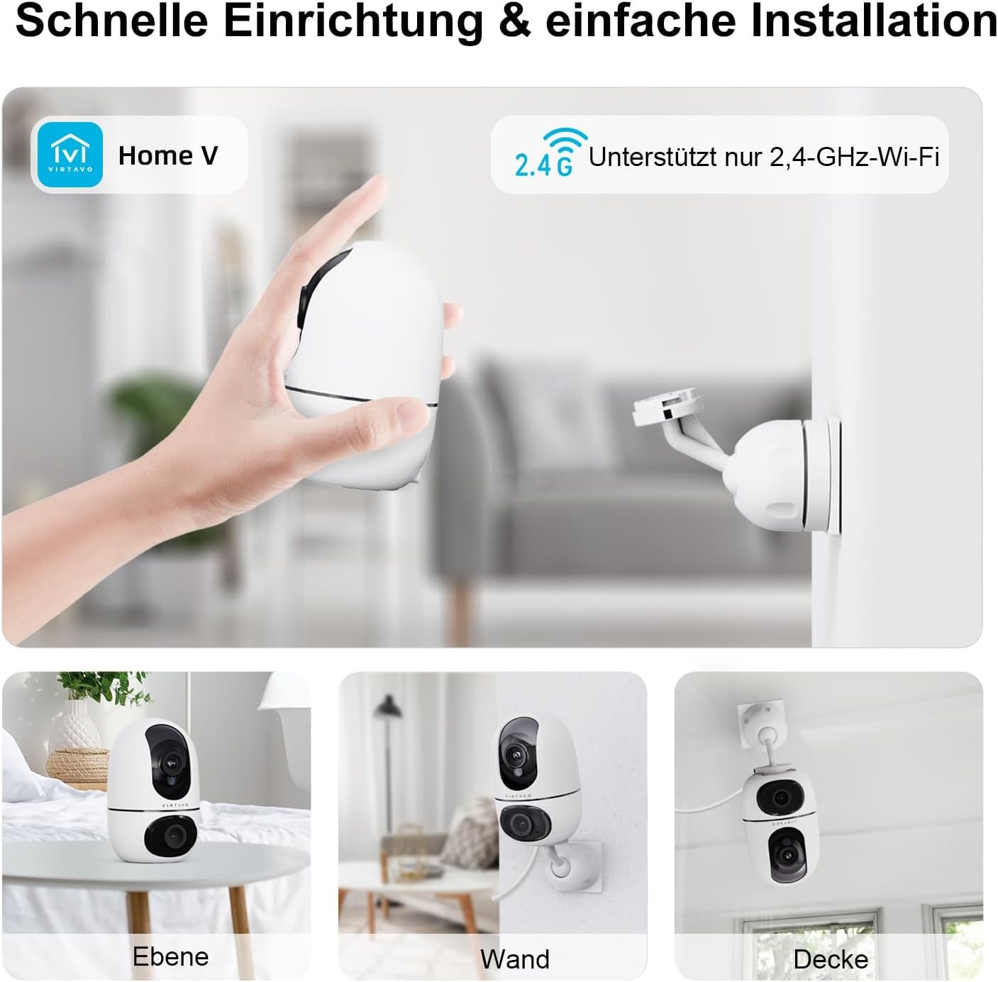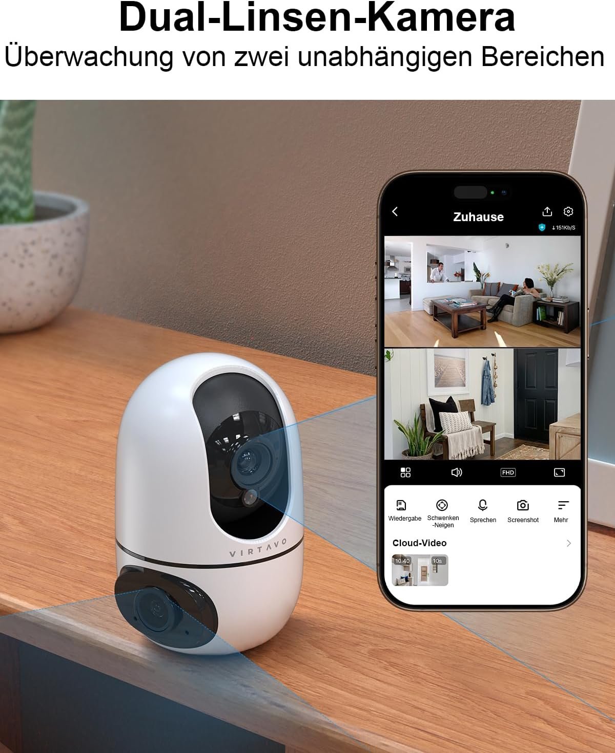 Virtavo Dual-Lens-Reiberwachungskamera innen, 1080p Wifi Video Kamera überwachung Inner, 360 ° PTZ, Wlan Kamera FHD, 2-Wege-Audio, Farbnacht, Auto-Tracking BeegungSerknung Fürr babys/haustile